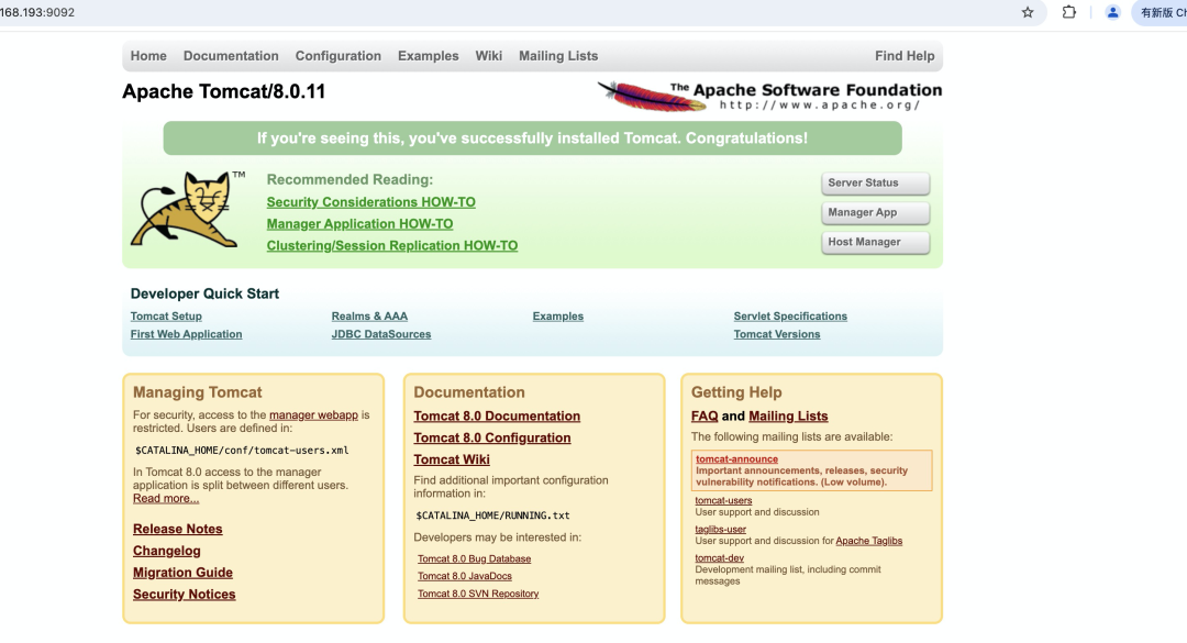 在浏览器中通过服务器的9092的端口,就访问到了容器中的tomcat。