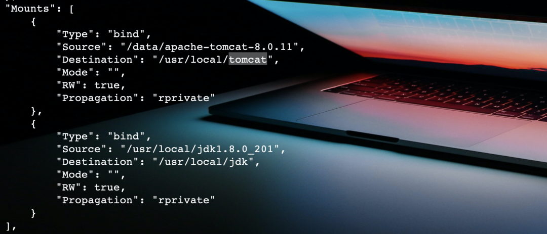 在容器信息中,我们可以看到挂载信息,宿主机上的JDK和tomcat目录已经被挂载到了容器卷中。