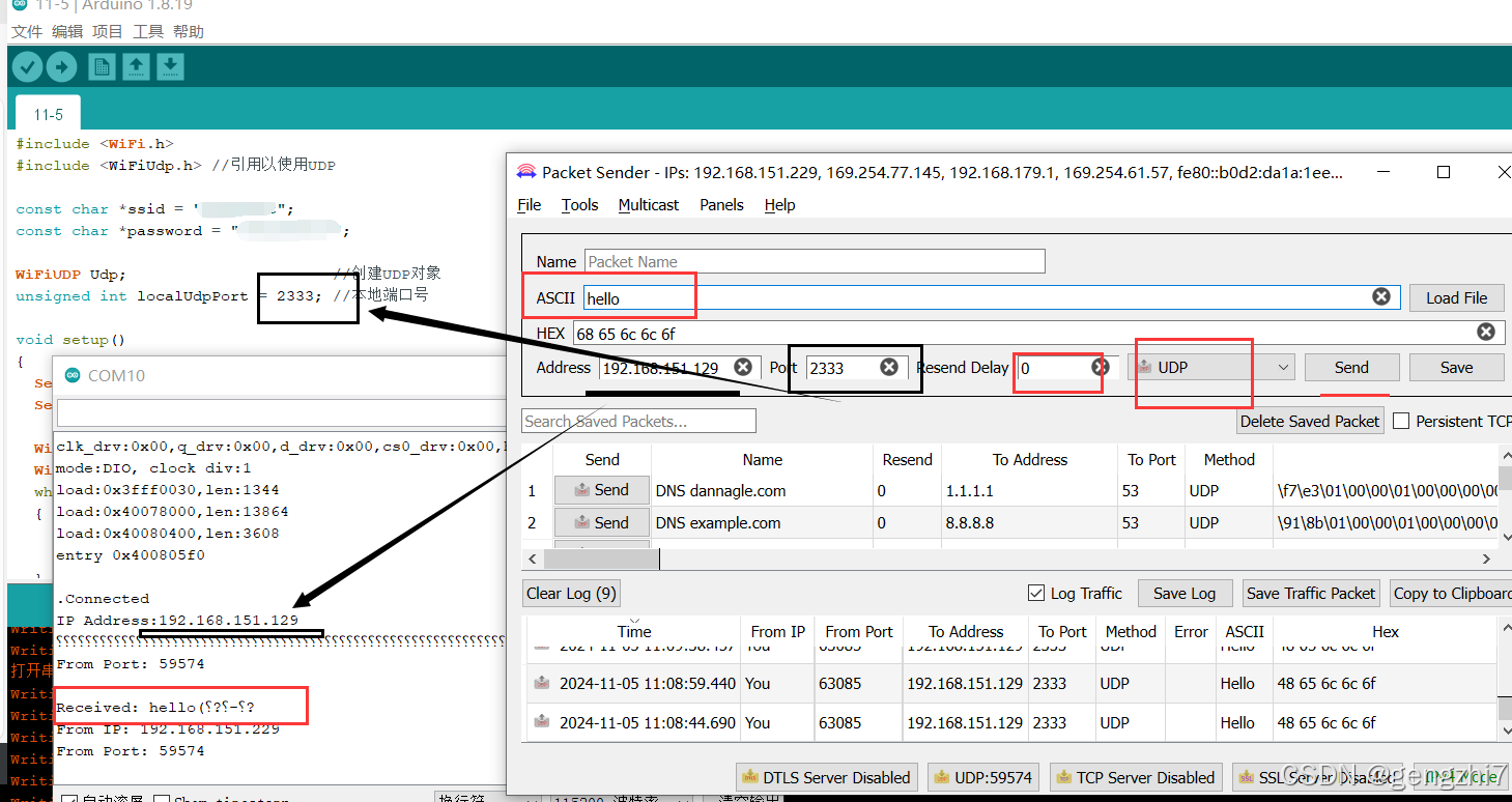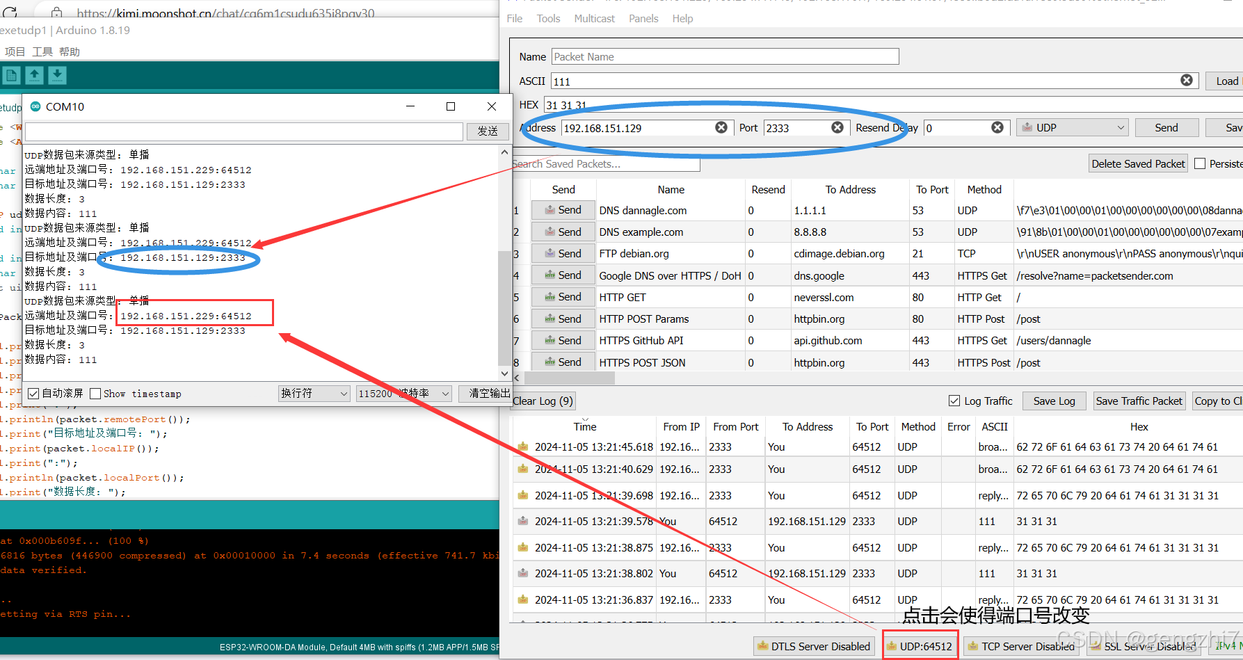 3.在esp32连接上wifi后,esp串口会输出产品的IP地址,此时可以用udp通信测试一下esp32是否能正确接收到udp通信传输来的信息(ESP32与电脑需要在同一个网络下)