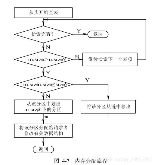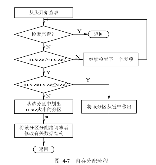 系统应利用某种分配算法,从空闲分区链(表)中找到所需大小的分区。设请求的分区大小为 u.size,表中每个空闲分区的大小可表示为 m.size。若 m.size-u.size≤size(size 是事先规定的不再切割的剩余分区的大小),说明多余部分太小,可不再切割,将整个分区分配给请求者;否则(即多余部分超过 size),从该分区中按请求的大小划分出一块内存空间分配出去,余下的部分仍留在空闲分区链(表)中。然后,将分配区的首址返回给调用者。
