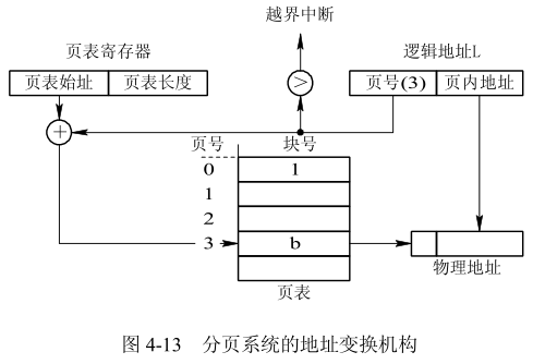 在执行检索之前,先将页号与页表长度进行比较,如果页号大于或等于页表长度,则表示本次所访问的地址已超越进程的地址空间。于是,这一错误将被系统发现并产生一地址越界中断。若未出现越界错误,则将页表始址与页号和页表项长度的乘积相加,便得到该表项在页表中的位置,于是可从中得到该页的物理块号,将之装入物理地址寄存器中。与此同时,再将有效地址寄存器中的页内地址送入物理地址寄存器的块内地址字段中。这样便完成了从逻辑地址到物理地址的变换。