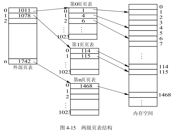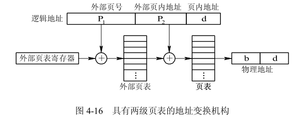 上述对页表施行离散分配的方法,虽然解决了对大页表无需大片存储空间的问题,但并未解决用较少的内存空间去存放大页表的问题。换言之,只用离散分配空间的办法并未减少页表所占用的内存空间。解决方法是把当前需要的一批页表项调入内存,以后再根据需要陆续调入。在采用两级页表结构的情况下,对于正在运行的进程,必须将其外层页表调入内存,而对页表则只需调入一页或几页。