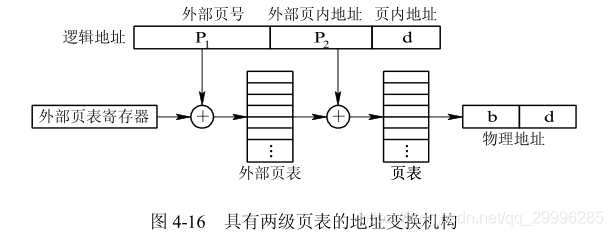 为了地址变换实现上的方便起见,在地址变换机构中同样需要增设一个外层页表寄存器,用于存放外层页表的始址,并利用逻辑地址中的外层页号,作为外层页表的索引,从中找到指定页表分页的始址,再利用 P 2 作为指定页表分页的索引,找到指定的页表项,其中即含有该页在内存的物理块号,用该块号和页内地址 d 即可构成访问的内存物理地址。