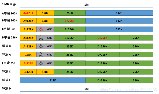 释放C时,由于c原来的64k旁边的64k也是空闲的,因此将两块合并成一块128k的空闲块。