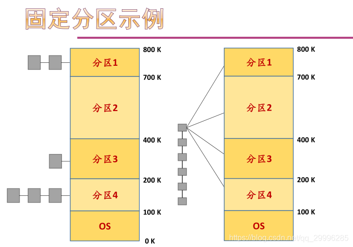 (1) 分区大小相等,即使所有的内存分区大小相等。其缺点是缺乏灵活性,即当程序太小时,会造成内存空间的浪费;当程序太大时,一个分区又不足以装入该程序,致使该程序无法运行。