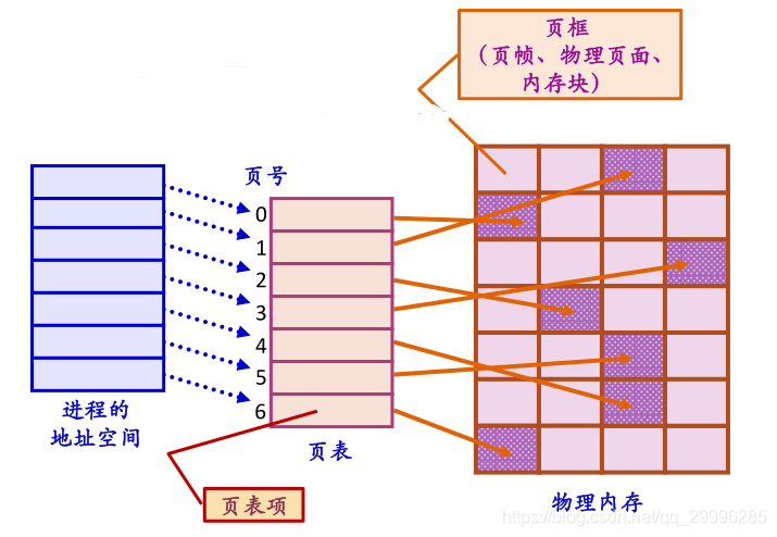- 内存空间按同样大小划分为大小相等的区域,称为页框,从0号开始编号