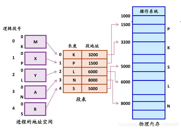 分段式存储管理系统中,为每个分段分配一个连续的分区,而进程中的各个段可以离散地移入内存中不同的分区中。为使程序能正常运行,亦即,能从物理内存中找出每个逻辑段所对应的位置,应像分页系统那样,在系统中为每个进程建立一张段映射表,简称“段表”。