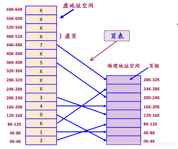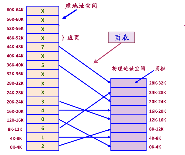 上图中,虚地址空间中的0号页面被加载到内存的0k-4k的页框内,1号页面被加载到内存4k-8k的页框内。