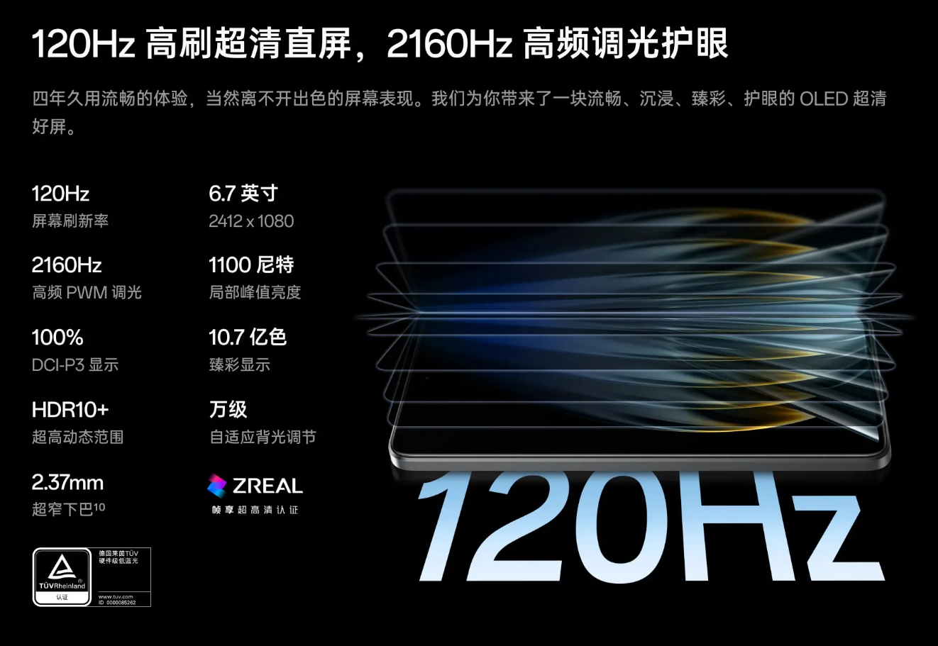 - 屏幕:6.7英寸OLED屏(1920Hz高频pwm调光),120Hz刷新率,1080P