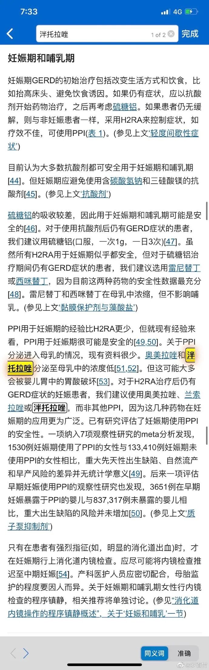 UpToDate临床顾问:质子泵抑制剂(PPI)用于妊娠期的经验比H2RA更少,但就现有经验来看,PPI用于妊娠期很可能是安全的。关于PPI分泌进入母乳的情况,现有资料很少。奥美拉唑和泮托拉唑分泌至母乳中的浓度低。但这可能大多会被婴儿胃中的胃酸破坏。对于H2受体拮抗剂(H2RA)治疗后仍有胃食管反流病(GERD)症状的妊娠患者,我们建议使用奥美拉唑、兰索拉唑或泮托拉唑,而非其他PPI,因为这几种药物在妊娠期的应用更为广泛。已有研究评估了妊娠期使用PPI的安全性。