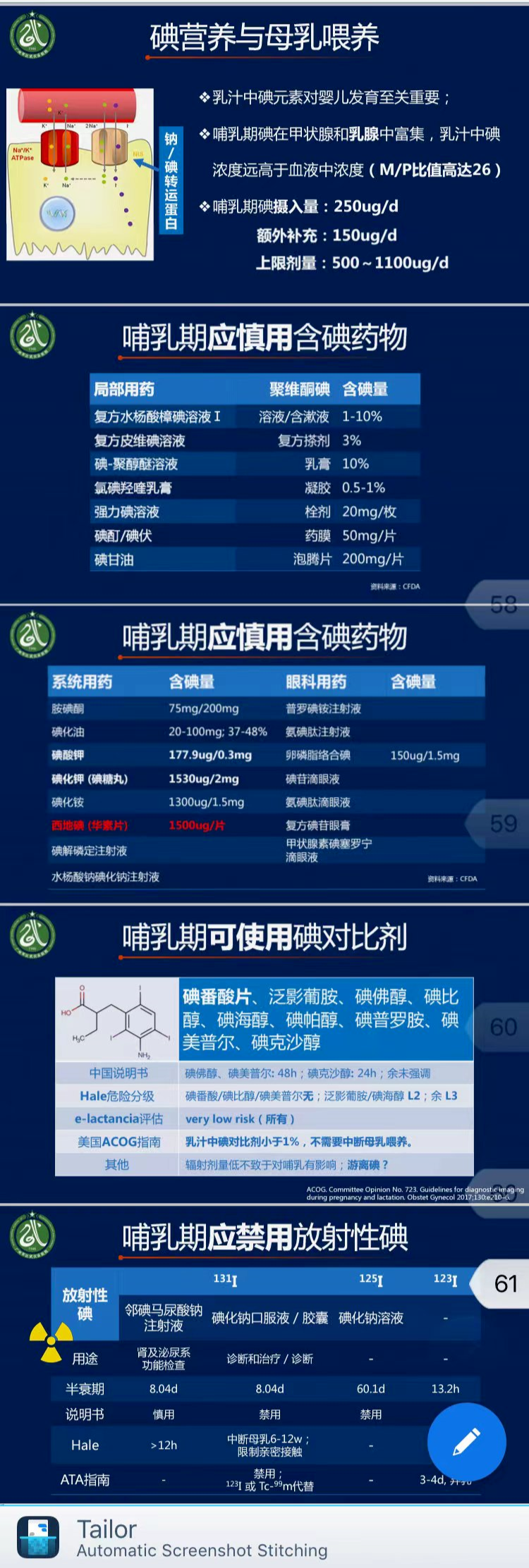 分享的一张图片,内容包括:碘营养和母乳喂养、哺乳期应慎用含碘药物、哺乳期可使用碘对比剂、哺乳期应禁用放射性碘。提醒:碘容易在乳汁里面富集,经常使用可能会干扰母乳宝宝甲状腺功能。日常里常见的含碘药物需要注意华素片(西地碘),每片含分子碘1.5毫克很高。