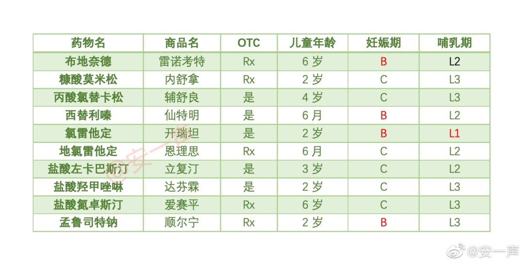 @罗百竹:妊娠期、哺乳期、儿童过敏性鼻炎常用药物适用年龄及安全性分级——包括布***(雷诺考特)、糠酸莫米松(内舒拿)、氟替卡松(辅舒良)、西替利嗪、氯雷他定、盐酸左卡巴斯汀(立复汀)、盐酸羟甲唑啉(达芬霖)、盐酸氮卓斯汀(爱赛平)、孟鲁司特钠(顺尔宁)!谢谢安医生!