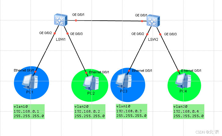 - 在小型企业或家庭网络中,通常将所有终端设备连接到交换机的 Access 接口,并划分到一个或几个 VLAN 中,以实现网络隔离和管理。