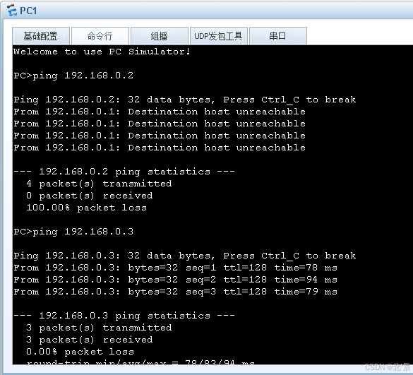 (1)鼠标左键双击PC1进入命令行,使用ping命令查看PC1与PC2 PC3是否可以连通