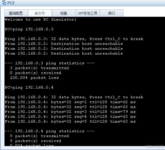 (2)鼠标左键双击PC2进入命令行,使用ping命令查看PC2与PC3 PC4是否可以连通