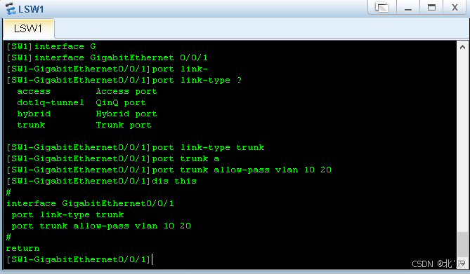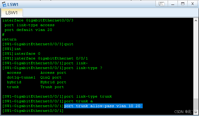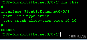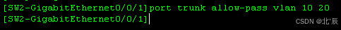 port trunk allow-pass vlan 10 20:表示已经放通vlan10 vlan20