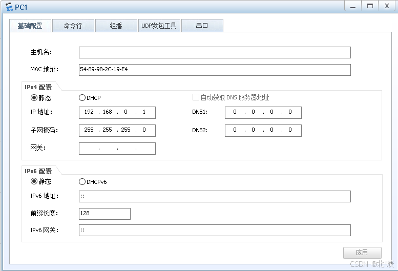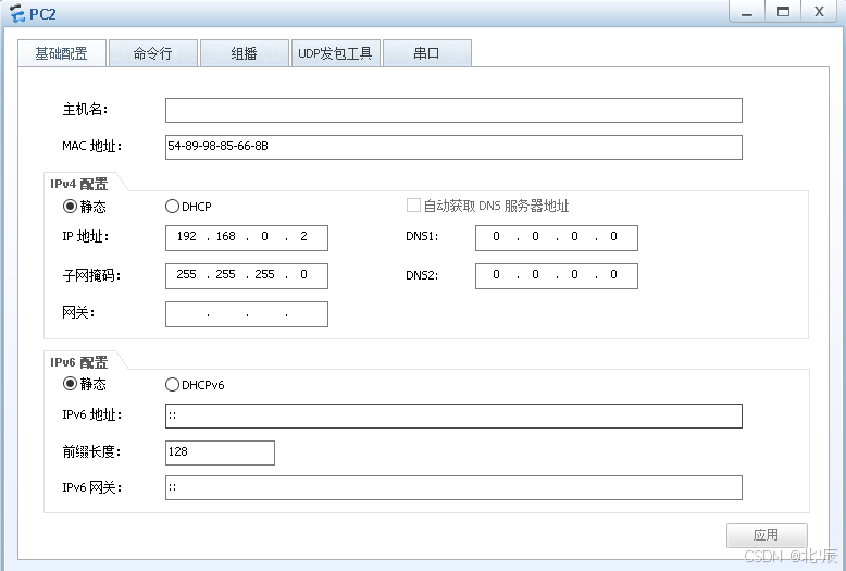 鼠标左键双击PC,配置相应参数,删除网关地址,配置好后点击应用
