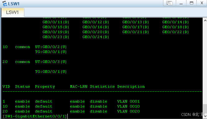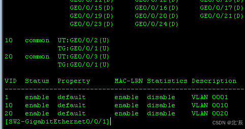 20 common UT:GE0/0/3(U) :表示vlan20中有:GE0/0/2端口和GE0/0/1端口 TG:GE0/0/1(U)