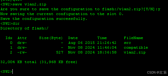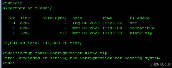 此时虽然保存了配置,但是交换机重启后不会导入配置,所以需要设置开机自动导入配置