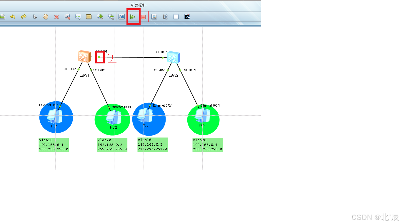 1、开启所有设备,拓扑线路变绿表示开启成功