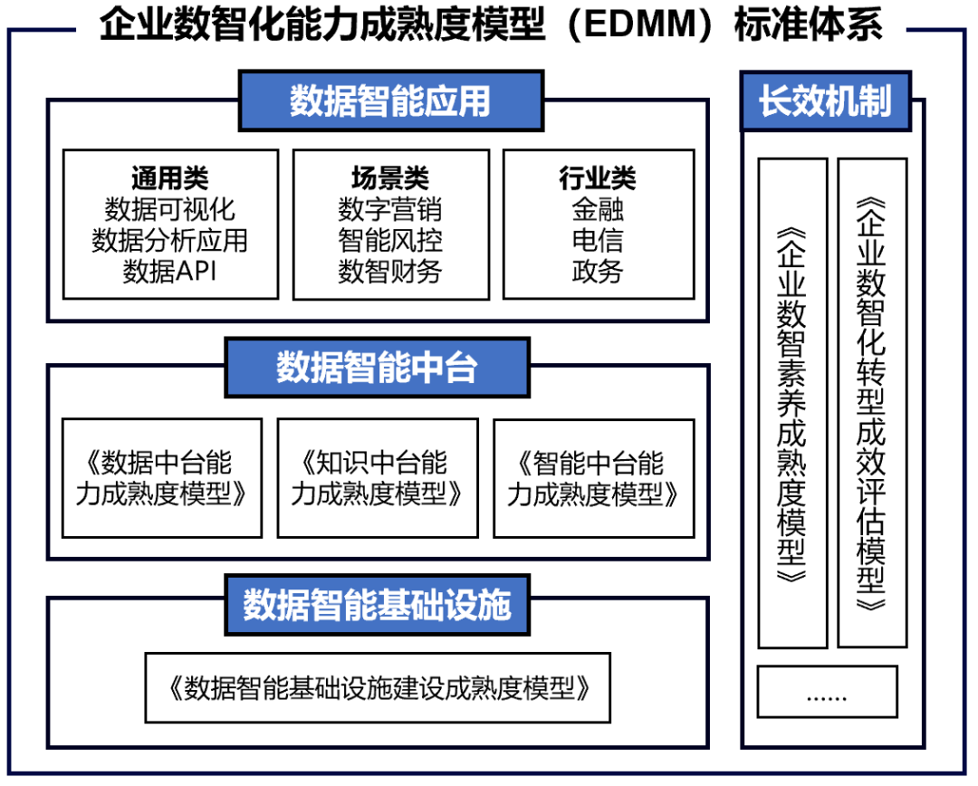 中国信息通信研究院(简称“中国信通院”)从2022年开始启动企业数智化能力成熟度模型(EDMM)标准体系工作,通过厘清企业进行数智化转型所需的关键能力框架,提供可对标的能力水平成熟度模型,助力企业进一步完善和提升相应能力,推动业务创新和管理优化。EDMM标准体系包括数据智能基础设施、数据智能中台、数据智能应用和长效机制四个方面,旨在为企业数智化转型提供全方位的能力支持和组织保障。
