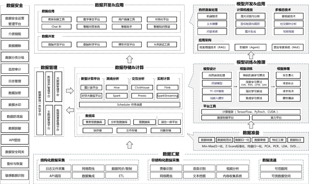 伴随数据与人工智能技术的不断融合,逐渐演化出“5+3”的技术体系。其中,数据技术分为数据汇聚、数据存储与计算、数据管理、数据开发与应用、数据安全五大部分;人工智能技术分为数据准备、模型训练与推理、模型开发与应用三大阶段。