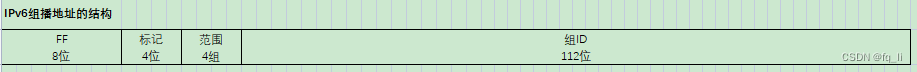 IPv6组播地址的前8位设定为 1111 1111——以FF开头。组播地址不能充当源地址或路由扩展头部的中间目的地址——只能用作目的地址,用来标识多个接口,它对应于一组接口的地址,且这些接口通常分属于不同的节点。由源节点发送到组播地址的数据包会被由该地址标识的每个接口所接收。