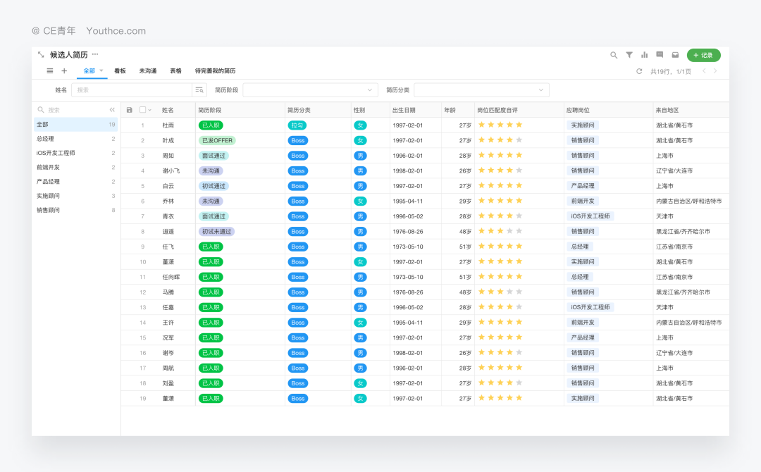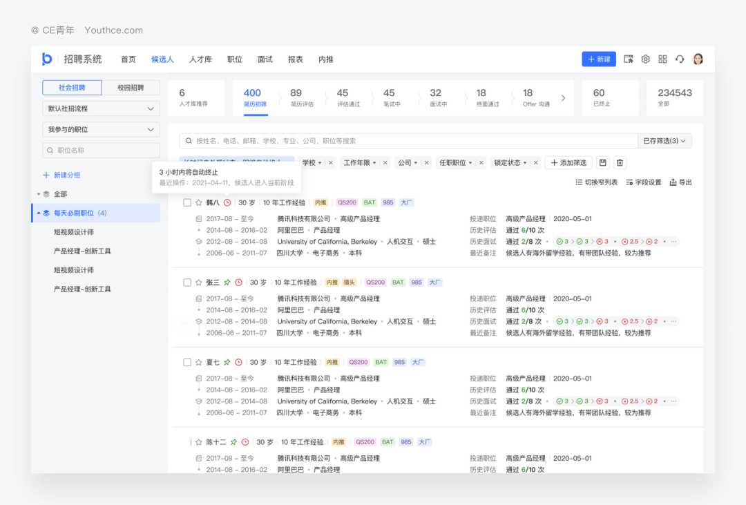 当然在部分产品当中,也会利用横向的空间,将重要的数据进行展示,比如在飞书招聘当中,由于招聘状态过于重要,因此这时候,就可以通过提高优先级的方式,将飞书的筛选放置在表格的顶部。