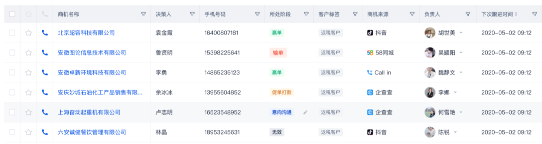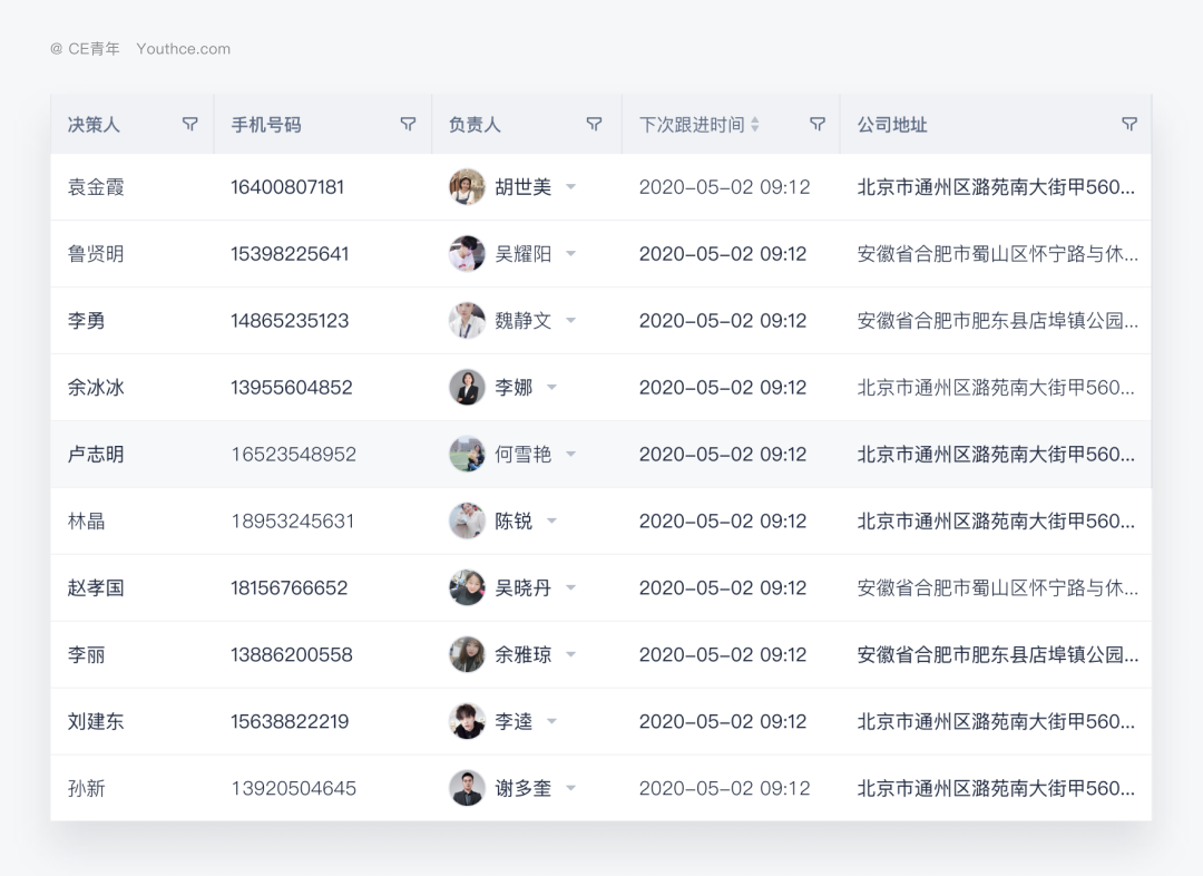 比如在一个 CRM 系统当中,由于 负责人 等字段类型本身只会存在一个,因此可以使用 头像+人名 的方式,来优化传统表格的呈现形式,丰富内容。