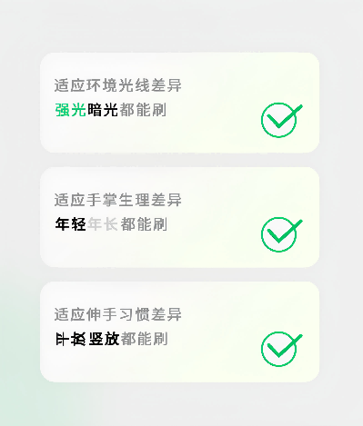在先进的“掌纹+掌静脉”识别技术运用下,用户只需在支持刷掌设备上简单挥动手掌,即可完成认证并成功支付。其不受光线限制,适用于多种场景,包括零售店铺、门票销售、会员卡支付、校园卡、交通卡等。同时,刷掌支付也不依赖手机等电子设备,可以为年长者和身体不便者提供更便利的支付选择,体现了社会包容和普惠性,使更多人享受到便捷支付的乐趣。