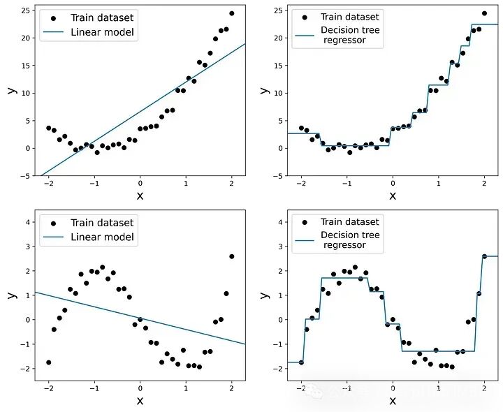 其中 ( \theta_0 ) 和 ( \theta_1 ) 是在训练过程中确定的模型参数。基于这个方程,模型预测 y 位于一条直线上。下图比较了线性模型的预测和决策树回归器的预测。这里我们有两个不同的数据集,我们将两种模型都适用于它们。