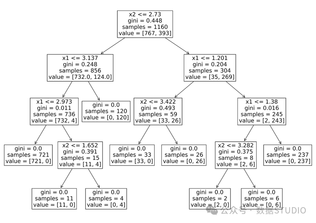 接下来使用 Scikit-learn 在这个数据集上创建并训练一个决策树分类器。模型拟合后,可以使用 plot_tree() 函数可视化决策树。