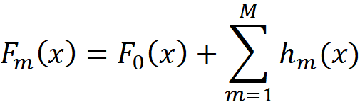 这里的 ( F_m(x) ) 是提升模型的最终预测。它是将这个集成中所有模型的预测加到基模型 ( F_0 ) 上的结果。我们使用训练数据集的示例得到了 ( F_m(x) ),但现在它也可以用来预测未见特征 x 的目标,这个特征不在训练数据集中。