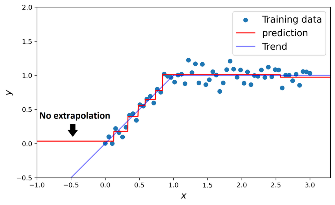 决策树分类器也存在同样的问题。决策边界总是以其边缘的垂直或水平线结束,不能呈现其他形式。外推问题与决策树的结构有关。在决策树中,每个节点都创建一个简单的预测。在训练数据集区间内,这些预测可以组合形成复杂的形态,在此区间外,我们只剩下覆盖那个区域的一个节点的简单预测。