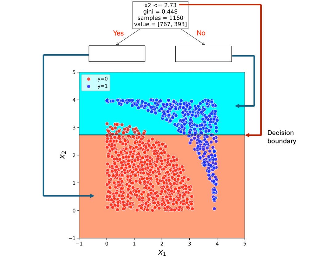 这棵树用来对数据点进行分类。我们将一个数据点(来自训练数据集或一个未见过的数据点)传递给它,它将决定其标签(y=0 或 y=1)。这是通过将数据点的特征值传递给决策树来完成的。假设我们想用上图中的决策树确定数据点(x₁, x₂)的标签,根节点将特征x₂的值与这里的阈值2.73进行比较。如果x₂≤2.73,转向左子节点。否则,转向右子节点。根节点通过直线x₂=2.73将特征空间分为两个区域,这条直线是根据阈值定义的。在一个区域中有x₂≤2.73,在另一个区域中有x₂>2.73。所以如果我们将根节点视为一个简单的分类器,这条线就充当决策边界。