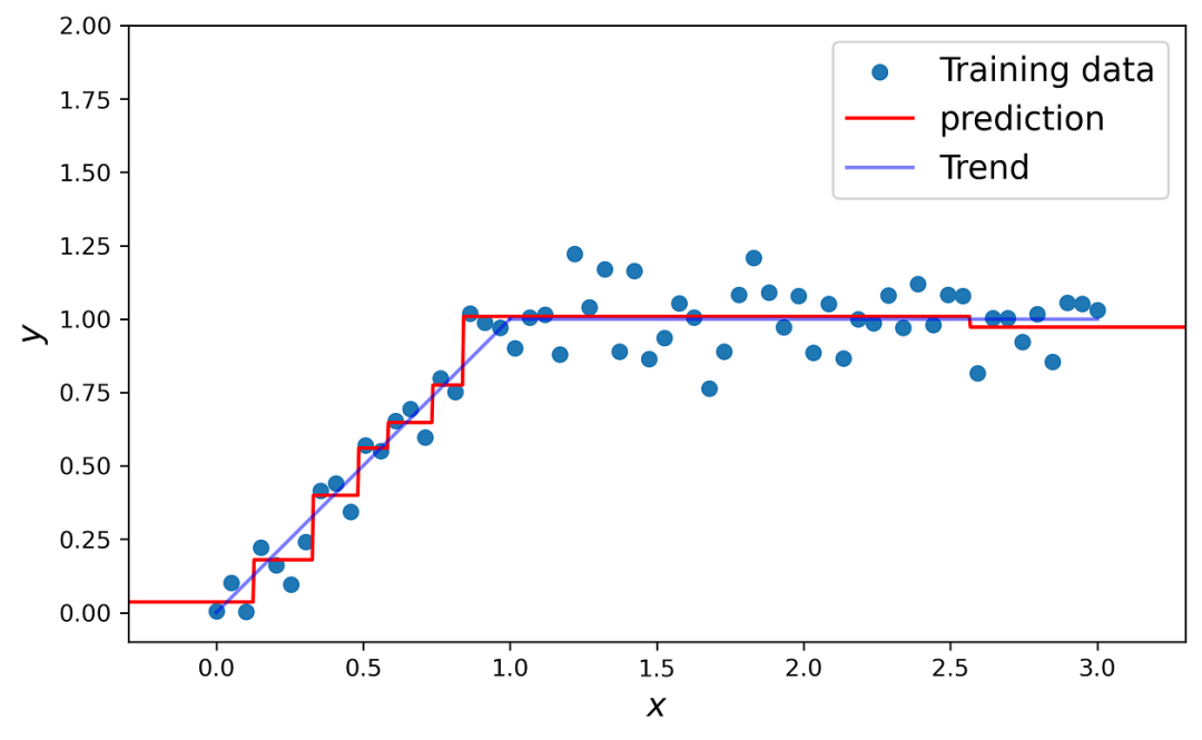 看到这里,你可能已经注意到决策树存在一个问题。数据集定义在区间[0, 3]内。由于预测是一条水平线,我们得到x小于零的所有值的恒定预测,也就是说对所有x大于3的值也得到一个恒定的预测。决策树回归器无法外推超出训练数据范围的数据。