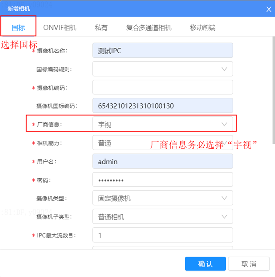 2)选择国标,其中厂商信息务必选择宇视(是使用国标扩展协议添加来实现直存的关键),其余参数按照国标相机添加方法正常配置即可。