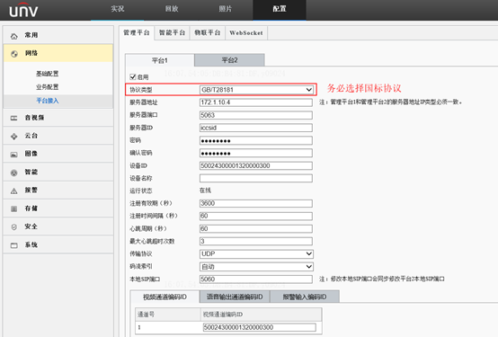 - 登陆IPC web,在网络->平台接入->管理平台处对相机进行国标接入的参数配置
