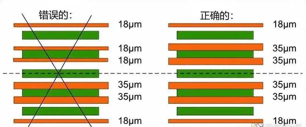 电路板层积层中的铜箔厚度应始终对称分布。可以制造不对称层堆积,但我们强烈建议不要这样做,因为可能会变形。