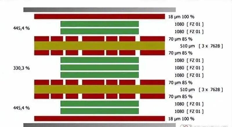 仅保持电源平面对称不足以达到均匀的铜包层。在分层和厚度问题上匹配预浸料和芯材也很重要。