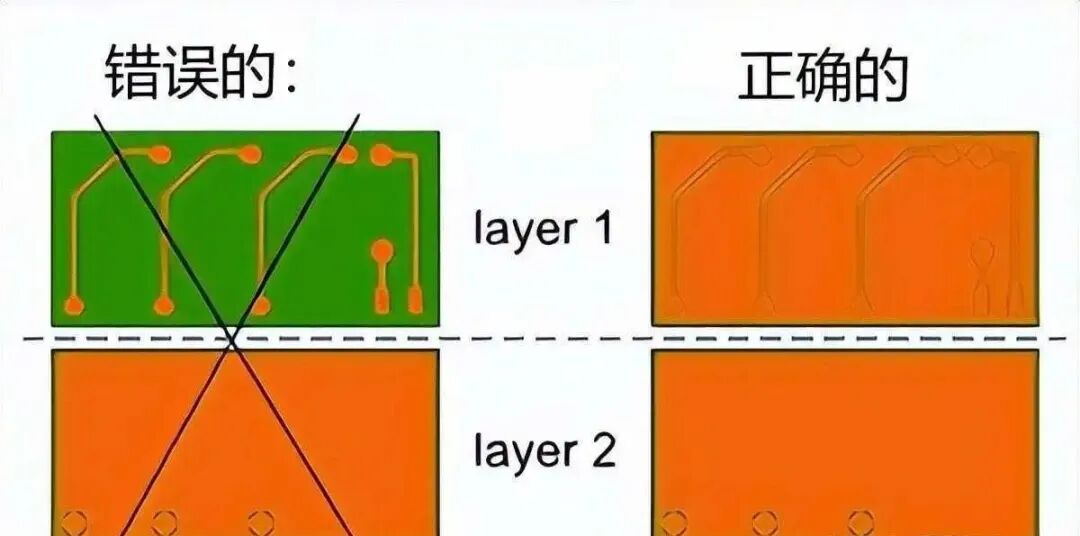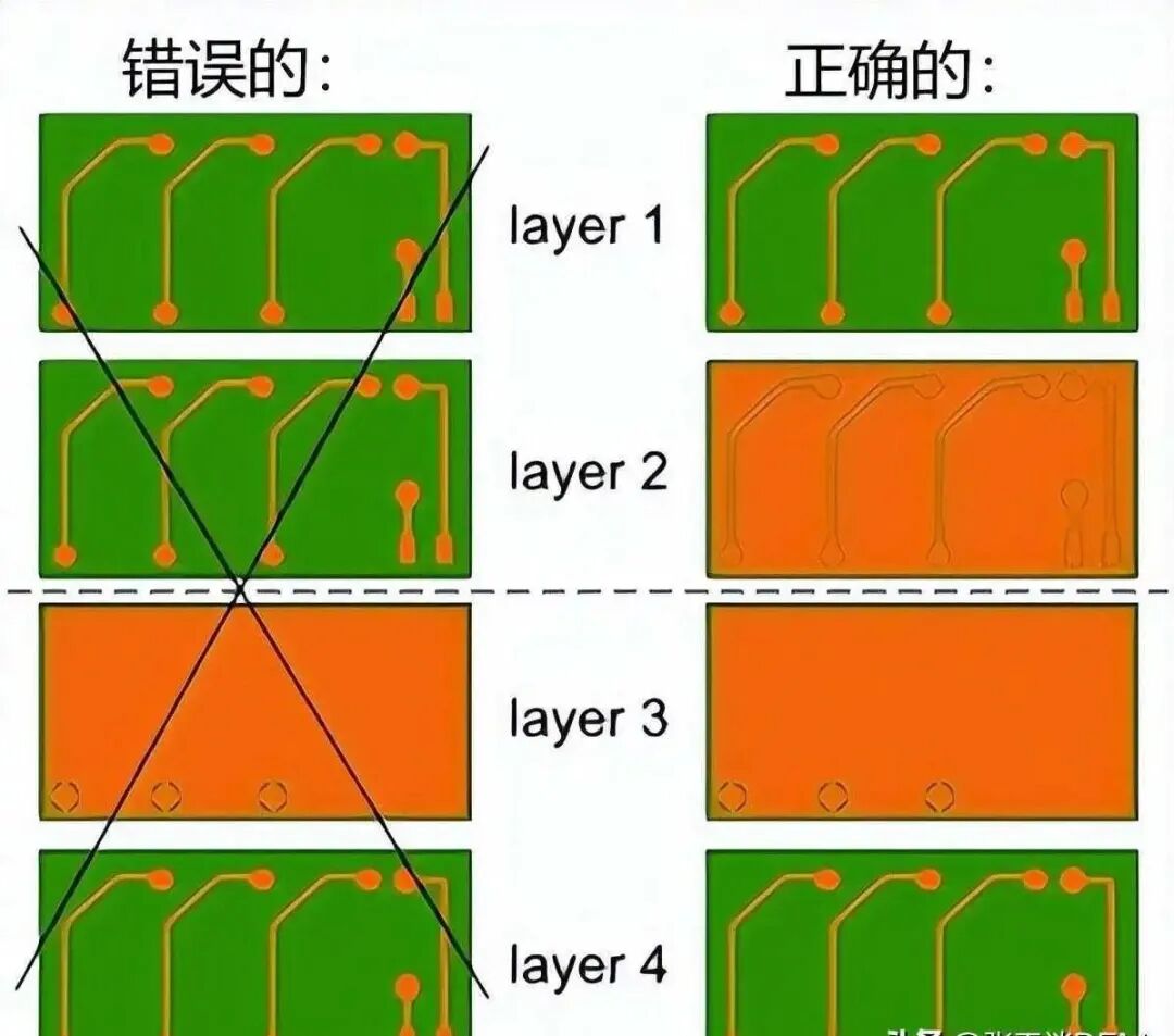 导体走线应均匀分布在电路板上。尽量避免铜窝。走线应在每一层上对称分布。