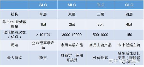 slc(单层存储单元)理论擦写次数10万次,mlc(双层存储单元)3000-10000次;tlc(三层存储单元)500-1000次;qlc(四层存储单元)仅仅150次,这样一个硬盘的寿命就很直观了。