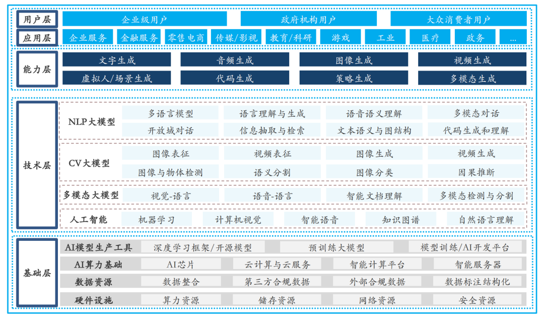 比如说,基础层将提供多模态基模型以及CV、NLP、多模态等领域大模型,输出泛化能力,对外开放大模型的调用接口;中间层将付费使用接口,直接调用基础模型,基于行业特色数据与知识进行精调开发行业大模型,精准适配AI具体应用需求;应用层上将进行多样化的SaaS应用以及新一代智能硬件的开发。