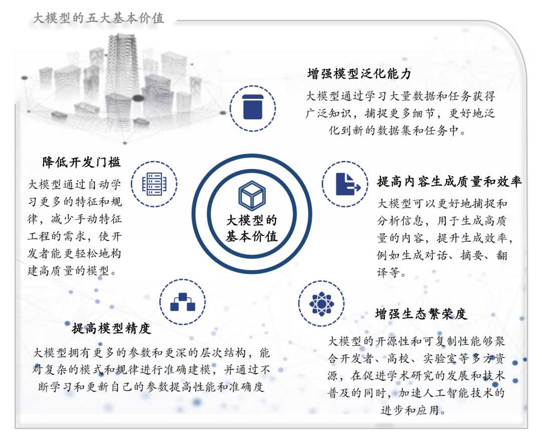 AI大模型具有多种价值,它能够降低开发门槛、提高模型精度和泛化能力、提高内容生成质量和效率等。一方面,大模型可以帮助降低机器学习和自然语言处理应用的开发门槛,使开发者能更轻松地构建高质量的模型。另一方面,大模型通常能够更好地泛化到新的数据集和任务中,提高内容生成质量和效率。