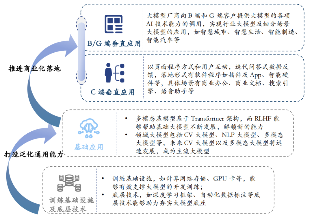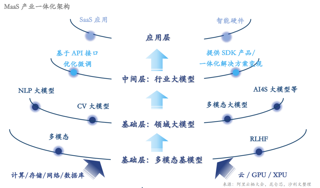 大模型“训练基础设施 – 底层技术 – 基础应用 – 垂直应用”发展路线逐渐清晰,MaaS(Model as a Service)将重构商业化生态。MaaS模式将由基础层、中间层以及应用层三部分组成,能够降低AI应用开发门槛,重构AI产业的商业化结构生态,激发新的产业链分工和商业模式不断涌现。