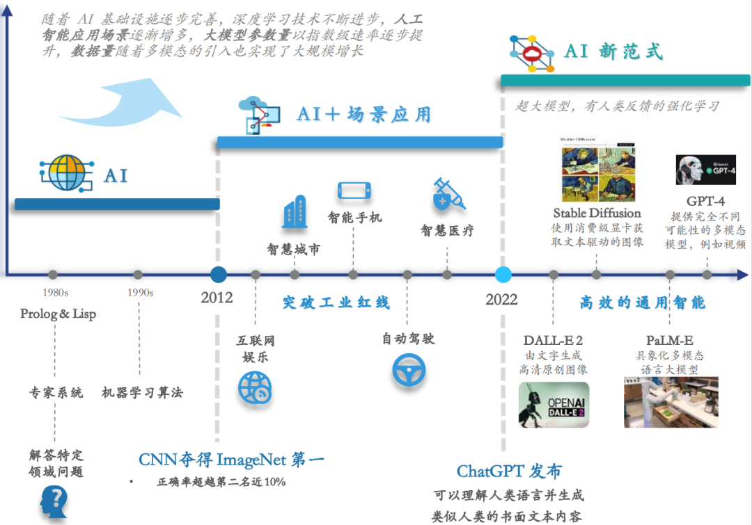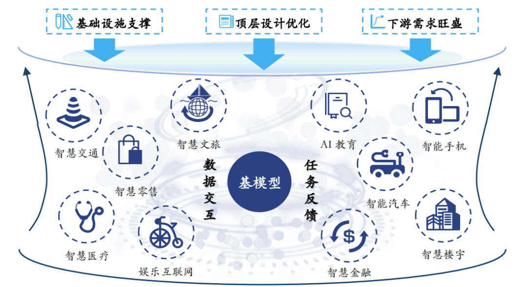 在“基础设施支撑 + 顶层设计优化 + 下游需求旺盛”三轮驱动下,AI大模型迎来了良好的发展契机。从政策环境来看,国家从“十二五”到“十四五”规划,对人工智能新技术、新产业给予了巨大支持,顶层设计也在不断细化、深化。地方政府也积极响应国家战略,加快规划人工智能产业建设。同时,国家还出台了相关管理条例,促进AI技术的规范应用和产业整体的高质量发展。