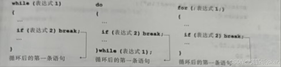 虽然 break 语句与goto语句都可用于终止整个循环的执行,但二者的本质区别在于句可以向任意方向跳转,可以控制流程跳转到程序中任意指定的语句位置,而break 语句只流程跳转到循环语句之后的第一条语句去执行,无须像goto语句那样用语句标号指示跳转的通句位置
