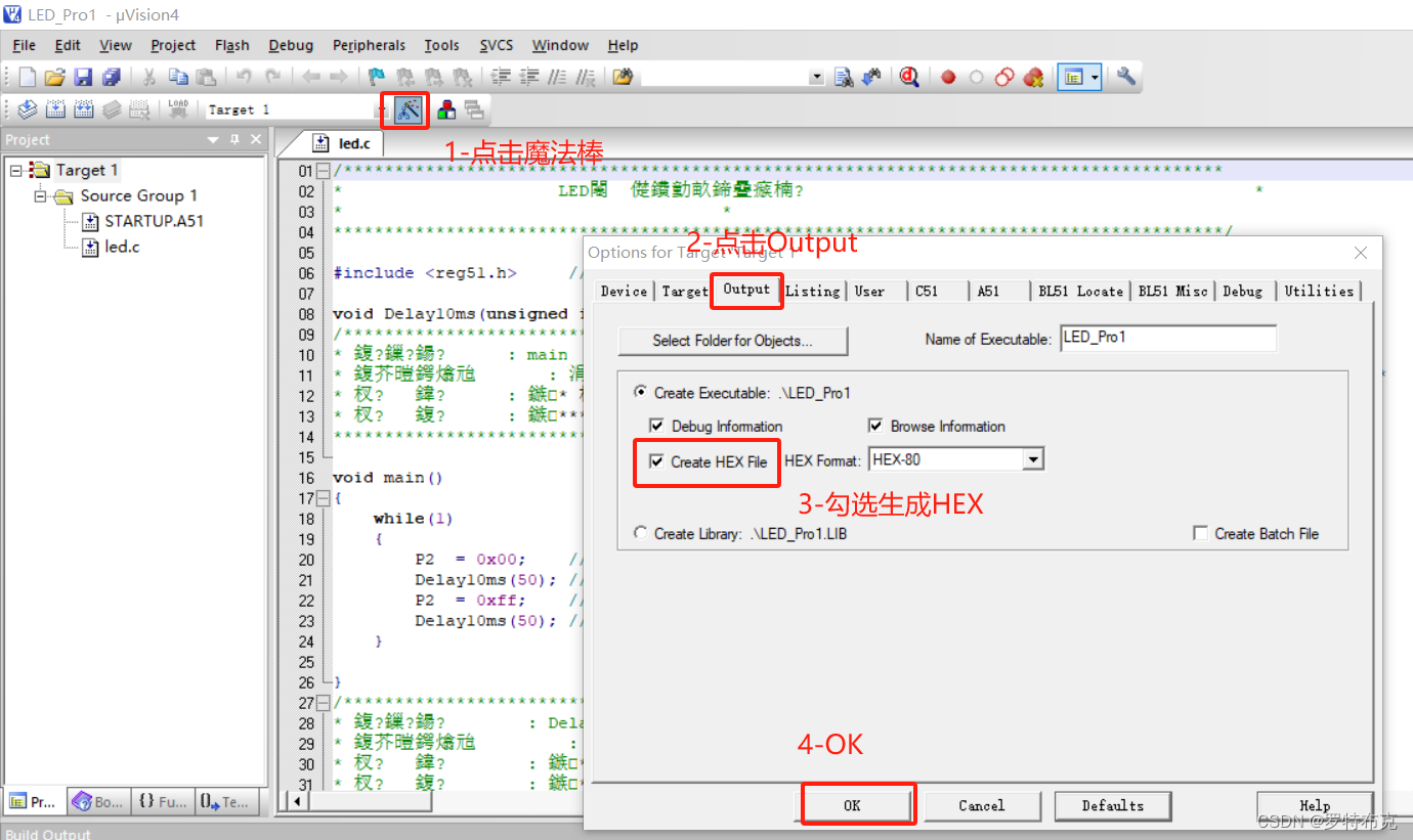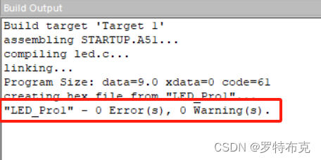 查看结果,生成了LED_Pro1名字的HEX文件,没有错误和警告就OK,有就需要修改重新编译。