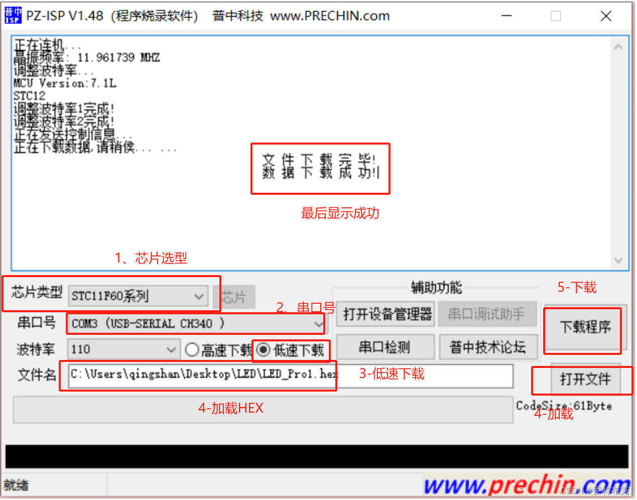 连接好电脑和开发板(先要安装CH340驱动)设置好点击下载,最后显示下载成功即可。