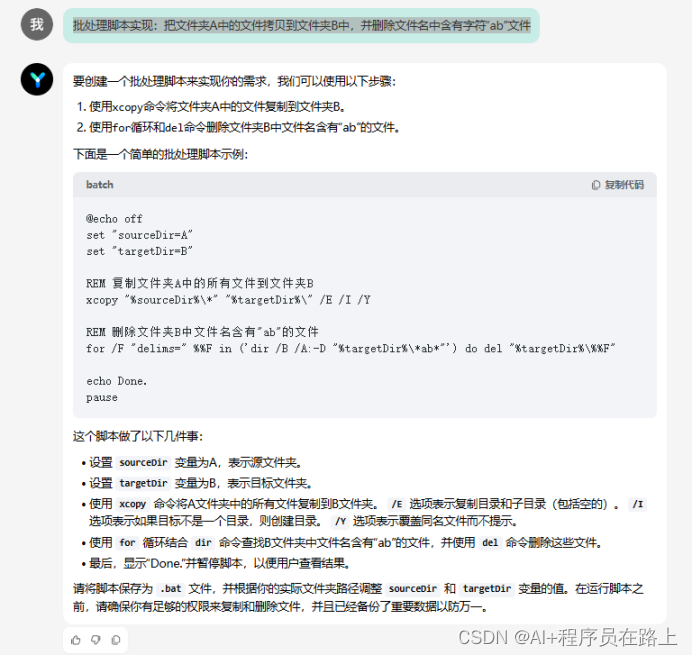 其他还有很多批处理命令,对初学者或者不太常用此功能的人来说,如果记住大多数命令并且还能写出来批处理的脚本相对来说比较困难的事情,但如果用人工智能就会变得非常轻松,AI编程对这种纯逻辑性的脚本处理非常在行,所以现在只需要记得几个自己经常用的命令即可,其他不常用的和基本的脚本编写交给AI即可。